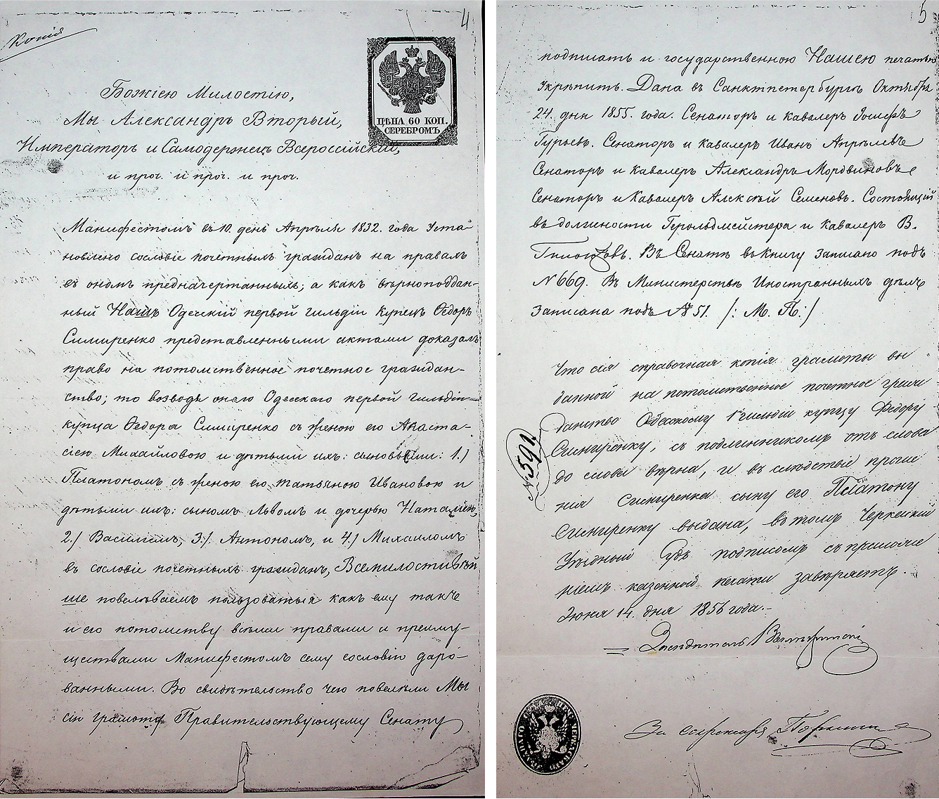 Грамота про надання купцеві першої гільдії Одеси Федору Симиренку та його родині стану спадкових почесних громадян, 1855