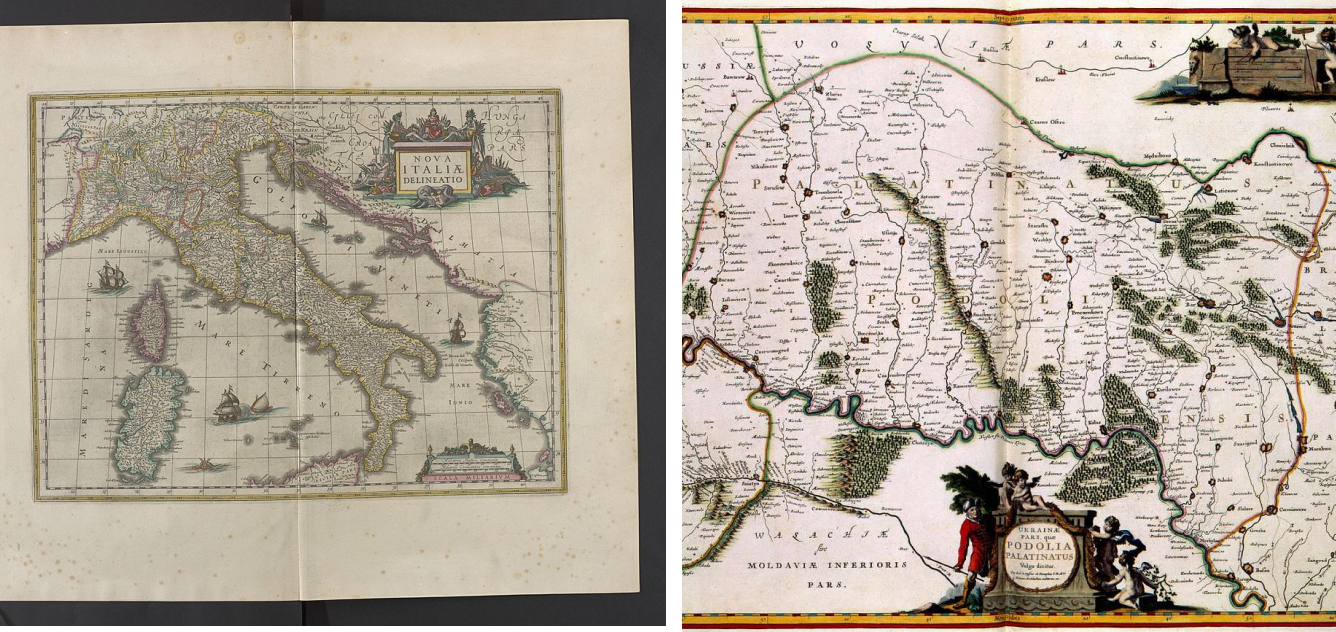 Ян Блау. Карта Італії, опублікована в «Атласі Майор», 1667 (справа). Гійом Левассер де Боплан. Карта Подільського воєводства, 1648 (зліва)