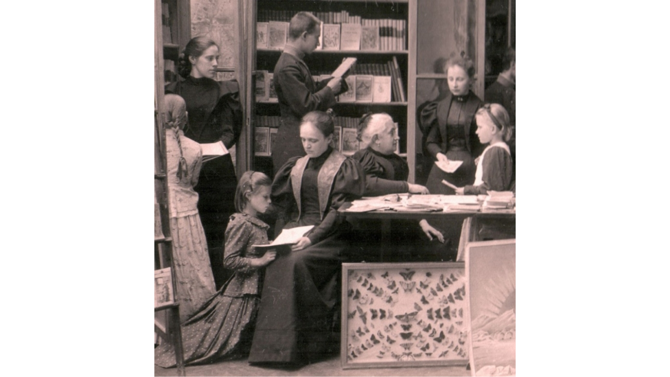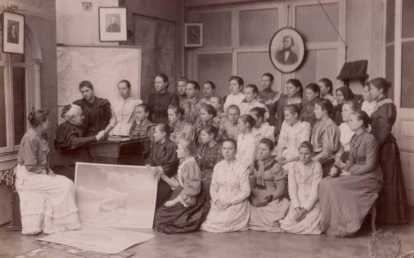 Христина Алчевська читає своїм ученицям, поч. ХХ ст. Джерело: Інтернет-видання «Гендер в деталях»