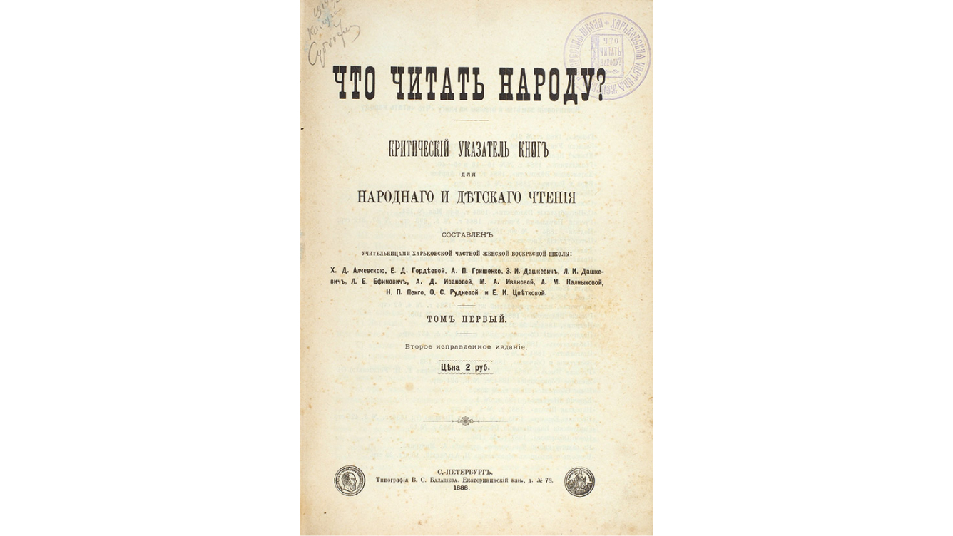 Титульна сторінка першого тому покажчика Христини Алчевської «Що читати народу?», 1888. Джерело: Інтернет-видання «Гендер в деталях»