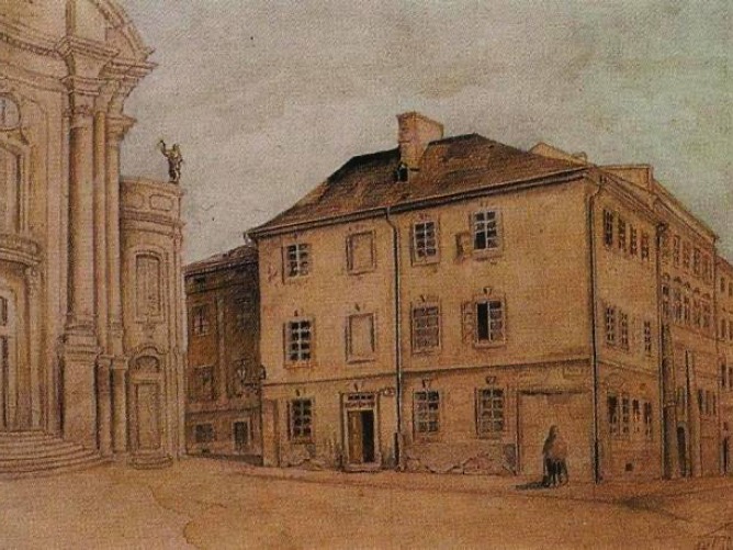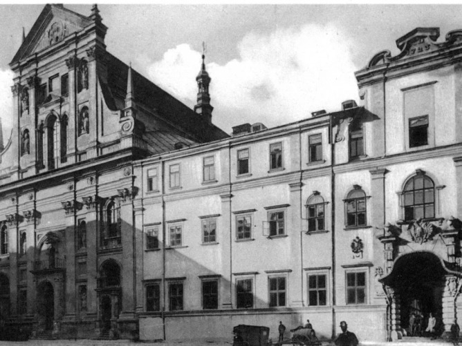 Костел єзуїтів та колегіум єзуїтів (1630, архітектор Джакомо Бріано) у Львові, 1911. Тут навчався гетьман Богдан Хмельницький (1596–1657)