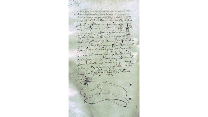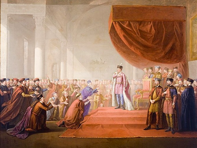 «Присяга короля Яна II Казимира на договорі», 1659. Затвердила Гадяцьку угоду, що надала Києво-Могилянській колегії статусу академії