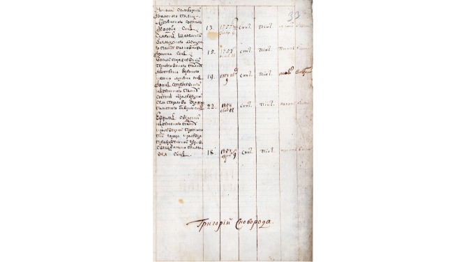 Фрагмент відомості про студентів піїтики Харківського колегіуму 1760 р. із підписом викладача Григорія Сковороди
