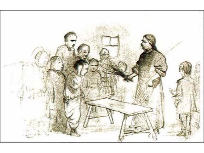 Василь Штернберг. «Покарання різками», 1840. На створення малюнка автора надихнула розповідь Тараса Шевченка про навчання у дяковій школі