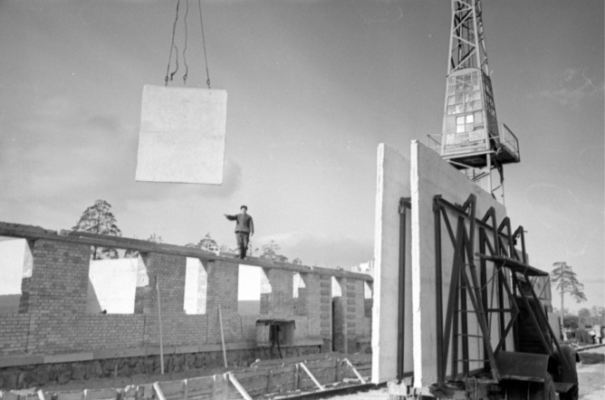 Установка міжкімнатних панелей під час будівництва Дарницького житлового масиву в Києві, 1959