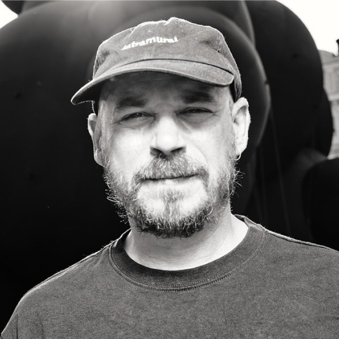 Олексій Сай на фоні своєї скульптури «I`m fine», 2024