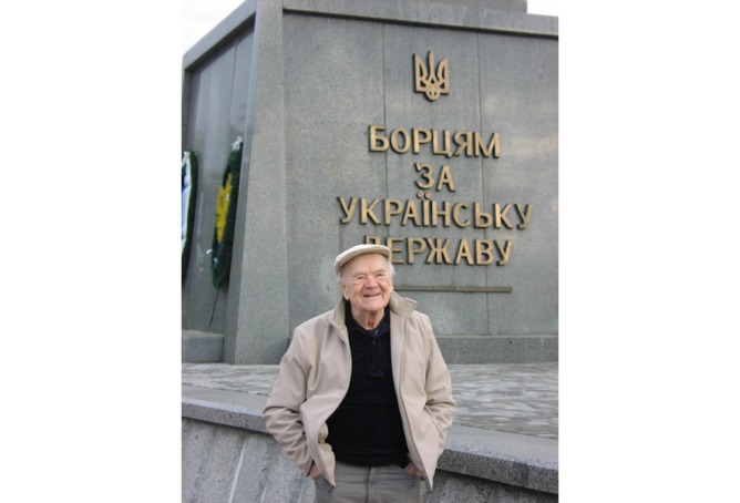 Омелян Антонович перед пам’ятником «Борцям за Українську державу». Долина, Івано-Франківська обл., 2005