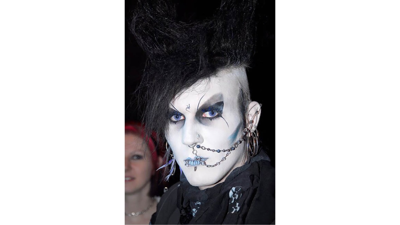 Зачіска також мала неабияке значення. Чорне волосся з косим чубчиком на одне око стало справжньою візитівкою стилю. Його носили як довгим, так і коротким, але головне — з чіткою формою, об’ємом і великою кількістю лаку. І хлопці, і дівчата користувалися косметикою: чорною підводкою, тінями для очей.