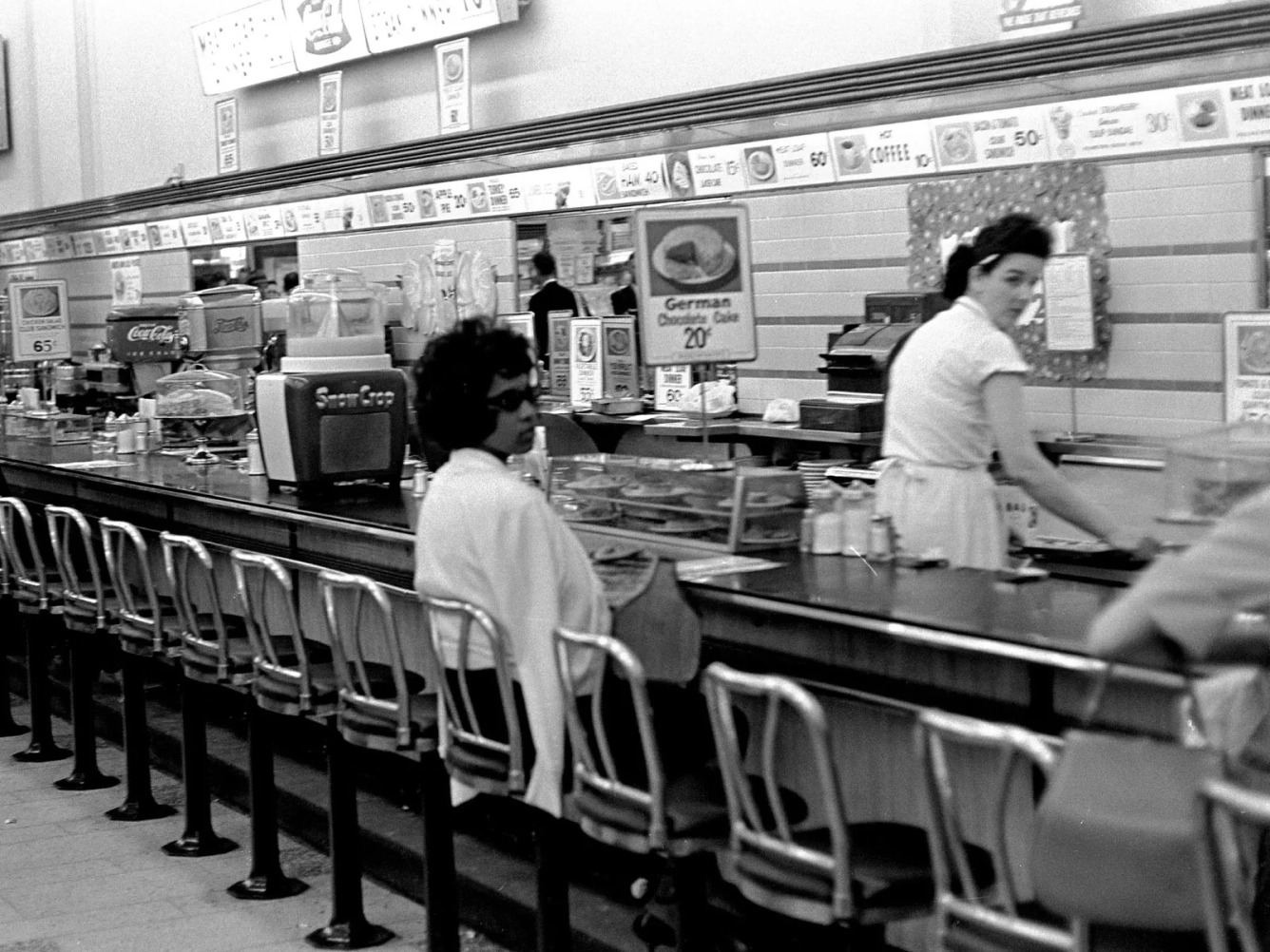 Афроамериканська студентка протестує проти расової сегрегації, сидячи за обідньою стійкою, призначеною для білих. Бірмінгем, США, 1963