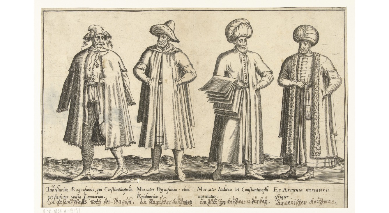 Характерний одяг представників східного купецтва (крайній праворуч — вірменин) на гравюрі Абрагама де Бройна, 1581