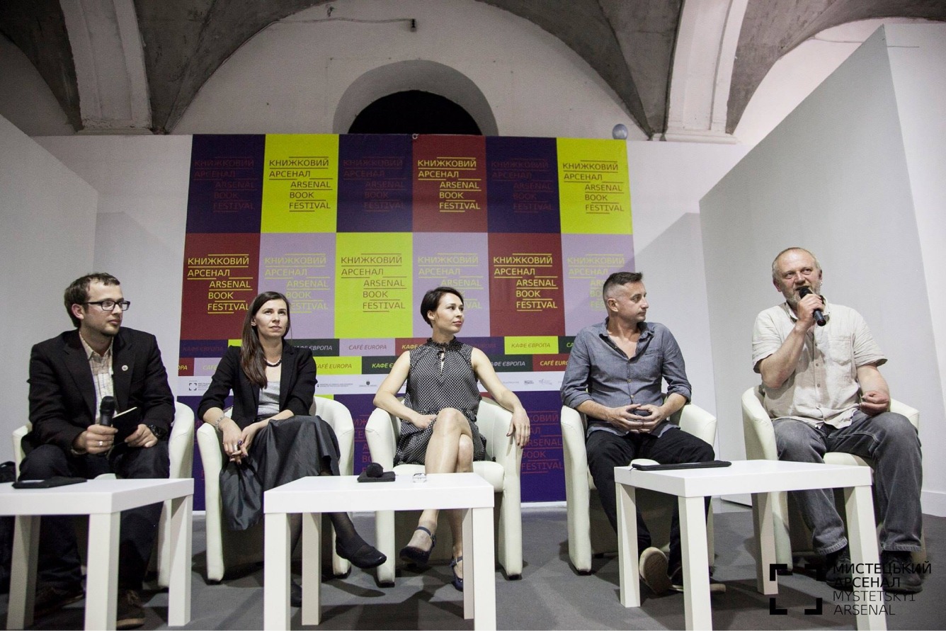 Лесь Белей (ліворуч) модерує дискусію «Self-made writer» в Мистецькому арсеналі з лауреатами Премії імені Джозефа Конрада. Учасники: Тарас Прохасько, Сергій Жадан, Таня Малярчук, Софія Андрухович. Джерело: Facebook Польський Інститут у Києві / Instytut Polski w Kijowie